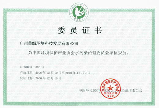 中国环境保护产业协会水污染治理委员会单位委员《委员证书》